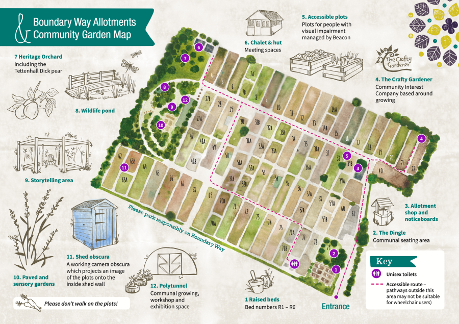Boundary Way Allotments and Community Garden is on the very edge of the Warstones estate in south-west Wolverhampton. The land climbs the side of Springhill and provides one of the best views across the rolling Staffordshire countryside and towards the hills of Shropshire.