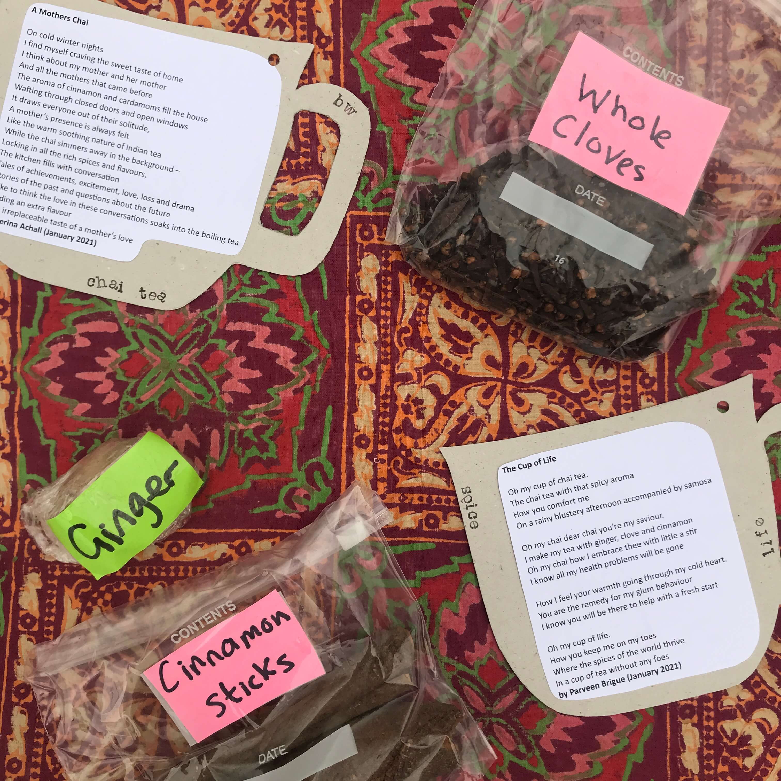 The Masala Chai project has been one that has grown with artist Kom Achall, culminating in commissioned poetry and a sharing event. Our exhibition featured a Masala Chai table exhibiting the spices used in this traditional, warming drink and commissioned poetry was also displayed from Kuli Kohli, Parveen Brigue and Serina Achall. Kom also provided us with colourful saris to decorate the exhibition, creating impact and reflecting the work of the project.