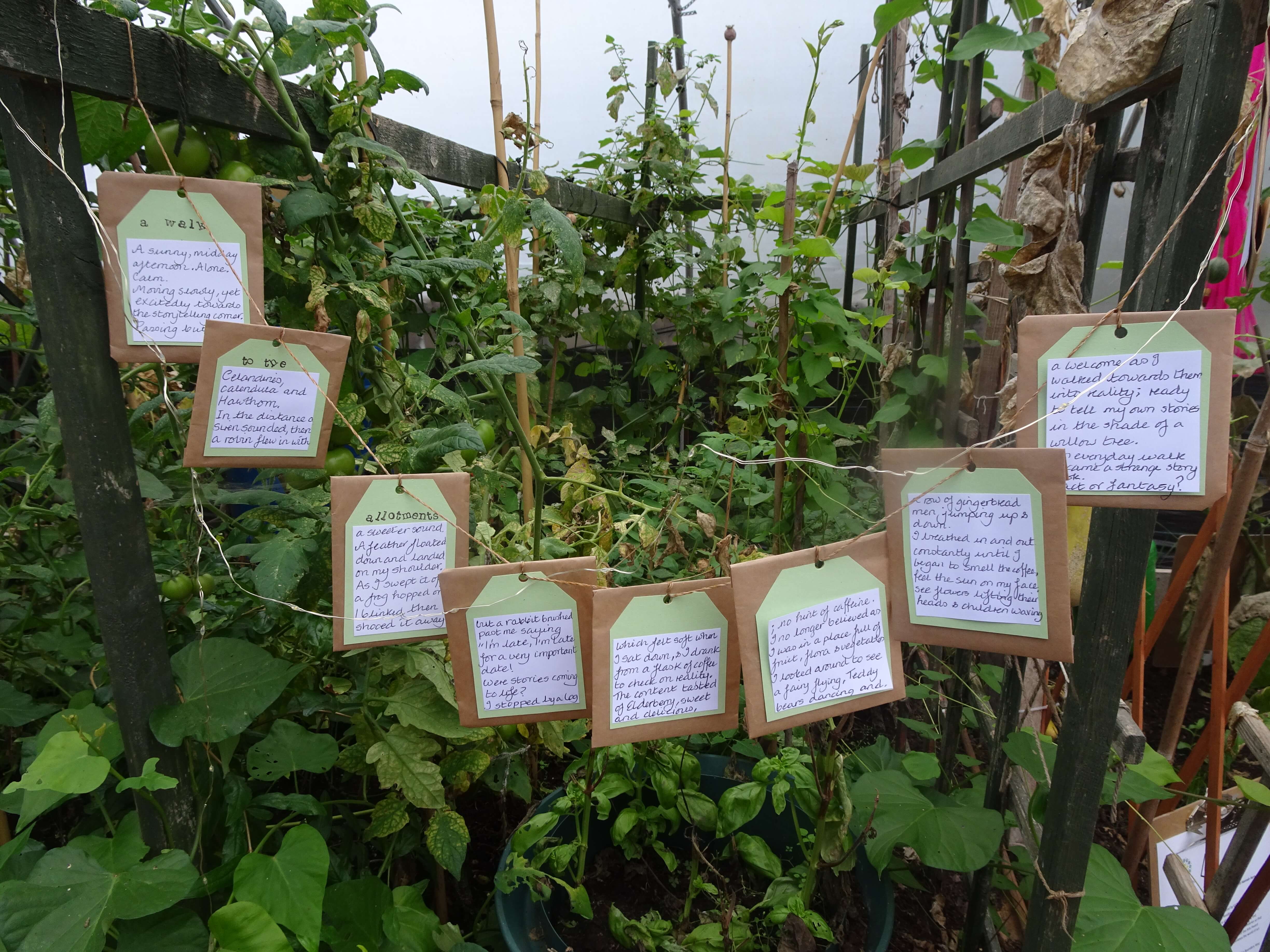 To keep the intrigue alive, we decided that for this exhibition we would use the whole poly tunnel space, which runs right down to the back where there is a section of raised beds. With plot holders willing to share their 'inside plots' for the day, we were so pleased to be able to integrate artwork and poetry from the last 18 months within the beds and draw people around the poly tunnel to appreciate the wholeness of the growing space. Amongst the foliage, hand-presented poetry from the Boundary Way Writer's Group, another group which was formed during lockdown, was shared in the environment much of it was inspired by. The Writer's Group meets online once a month, writing on green themes and often taking inspiration from imagery from Boundary Way Allotments and Community Garden. Thank you to the writers who shared their work with us, our visitors loved reading it and discovering them amongst the plants.