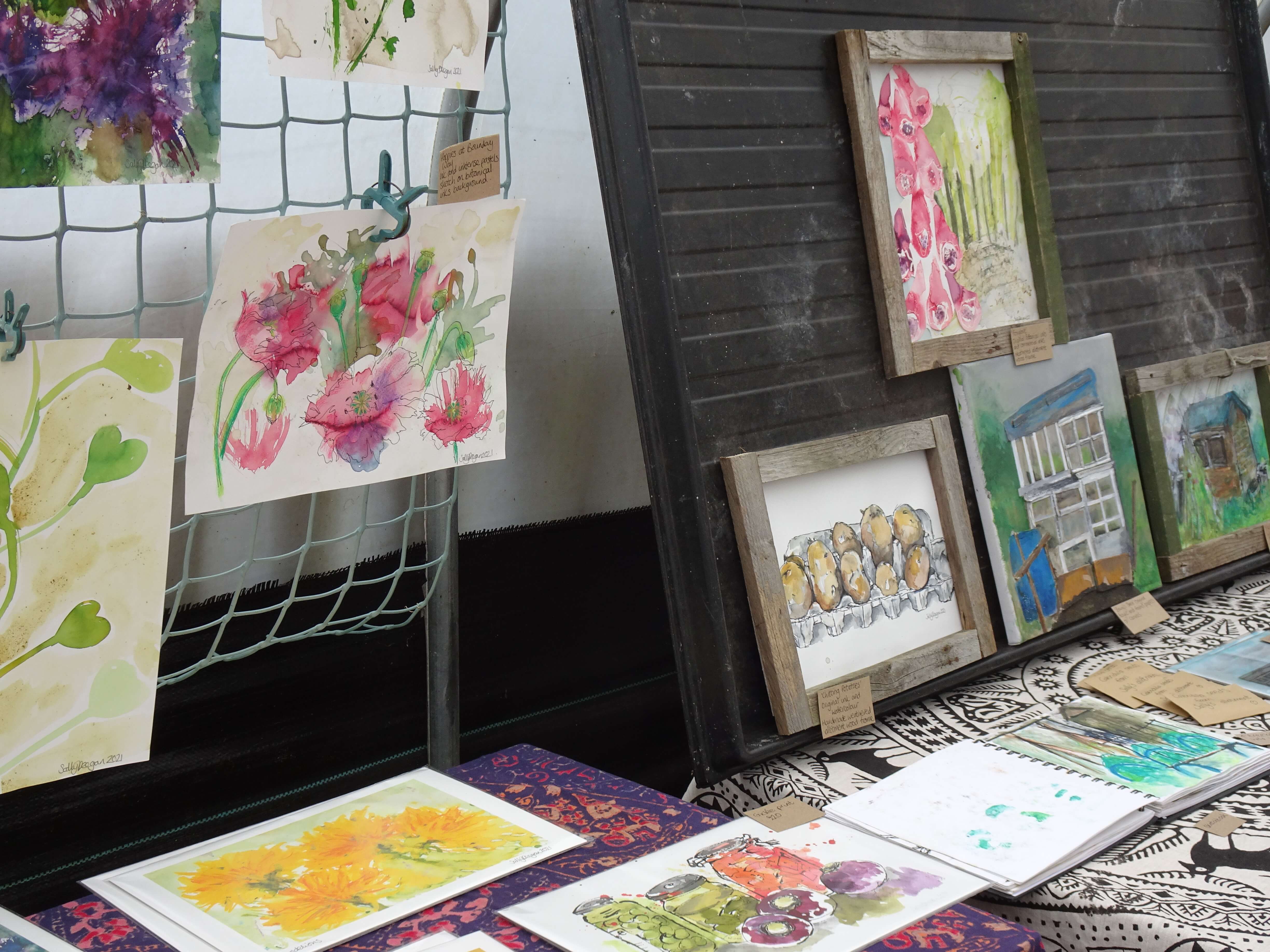 Colour came in abundance with the work of local artist Sally Deegan, who has found inspiration in Boundary Way Allotment, her own allotment and nature in the past year. We were delighted that Sally was able to exhibit her work on a site where some of her inspiration had first struck. Some of our favourite pieces feature structures from our site, such as Barry's shed, framed in inventive ways using everything from discarded windows to rusty bin lids. Sally's work fit perfectly into our setting and visitors delighted in chatting to her and viewing the work on display.